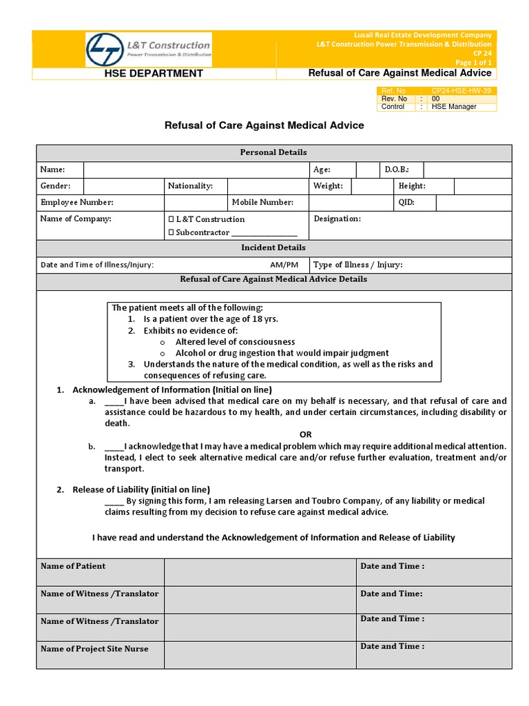 39 Refusal Of Care Against Medical Advise Health Care Public Health , The Form Is Offered To The Patient To Provide All The Details Of.