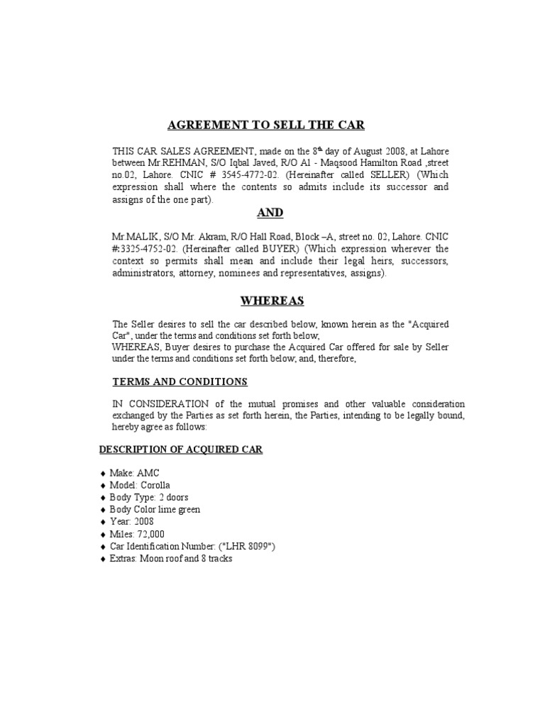 Agreement To Sell The Car Conveyancing Implied Warranty . I, The Buyer, Hereby Agrees To Buy From The Seller, The Above Mentioned Vehicle For The Sum.