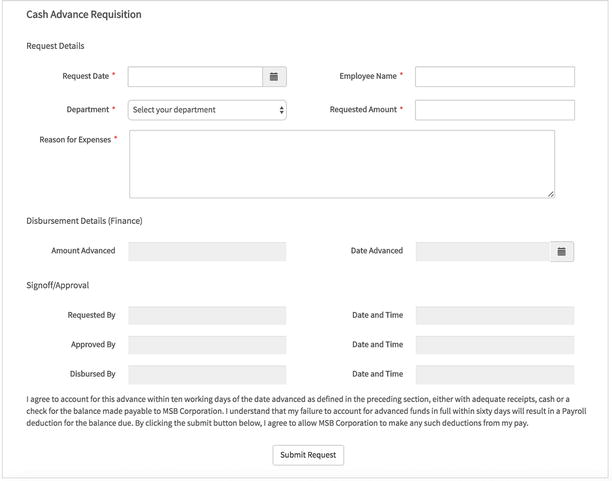 Employee Cash Advance Procedures Speaker Deck. Employee advances will only be issued to employees who are traveling with students or traveling internationally. An employee advance form is a document that an employee uses to get an advance payment for the services that he or she is to render in the future. Employee cash advance form template has personal and contact information, and bank and loan supervisor information. Do you want to receive the loan amount in your account? Cash should not be used to pay for purchases from vendors who accept credit cards. Any cash received from your credit card will automatically be treated as a cash advance. Employees with at least three (3) months tenure and has a probationary contract with the company are allowed to avail with the cash advance policy. Kindly refer on this but personalize it based on your company's standing and employee mortality. / free 6+ sample employee advance request forms in pdf | ms word. It includes the information about the cash advance being asked for and other data about the transaction that will be done. An employee advance form is a document that an employee uses to get an advance payment for the services that he or she is to render in the future. It is of great importance to be aware of the employment forms that companies may require so candidates are prepared to be interview, get hired, and are ready to start a new job. Payday wiki payday 2 along with cash advance loan stores are around every corner generally in most regions. Use this cash advance request form template for the employees or workers to submit their cash advanced. It includes the information about the cash advance being asked for and other data about the transaction that will be done.