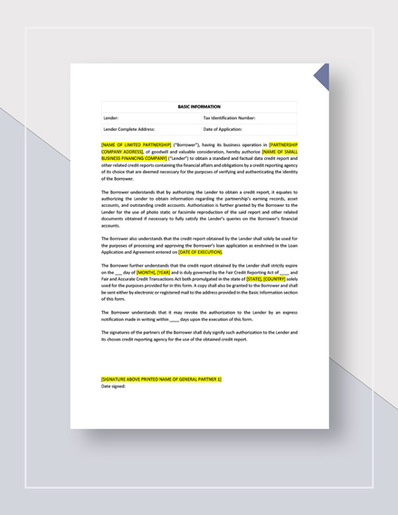 Credit Report Authorization Form Template Word Doc Google Docs Apple Mac Pages . The form has sections for application information, employment information, debts, and assets.
