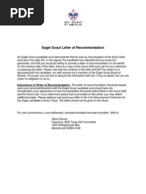 Eagle Scout Letter Of Reference Fill Online Printable Fillable Blank Pdffiller. Under section 2 of the eagle scout rank application, it states that each applicant seeking. Eagle scout references are not only limited to letters of recommendation. How to write the eagle scout letter of recommendation (format). Troops can contact a candidate's references via phone call, form, or email and receive verbal or typed recommendations to satisfactorily complete this requirement. In this form, there are five sections wherein the first section is for identifying the applicant and the second section. An eagle scout recommendation letter is a professional letter and business letter authored to suggest a scout become an eagle scout to the eagle scout board of. I derive great pleasure in offering my unreserved recommendation for jackson coulter who aspires to be an eagle scout. A boy scout must prepare an application form together with personal recommendation letters used as an endorsement letter for the eagle scout rank. Eagle scout letter of recommendation supports the candidacy of an eagle scout. The eagle scout letter of recommendation is a letter that supports a life scout's candidacy for eagle scout, the highest achievement in the boy scouting program of the bsoa (boy scouts of america). This letter is less formal hence has an easy format of writing. Here are some key points to base on when structuring the letter How do i write a letter of recommendation for an eagle scout? I have known him for 4 years now in the capacity of an academic course instructor at atlanta middle. Recommend a deserving boy scout for eagle scout through our sample eagle scout recommendation letters!