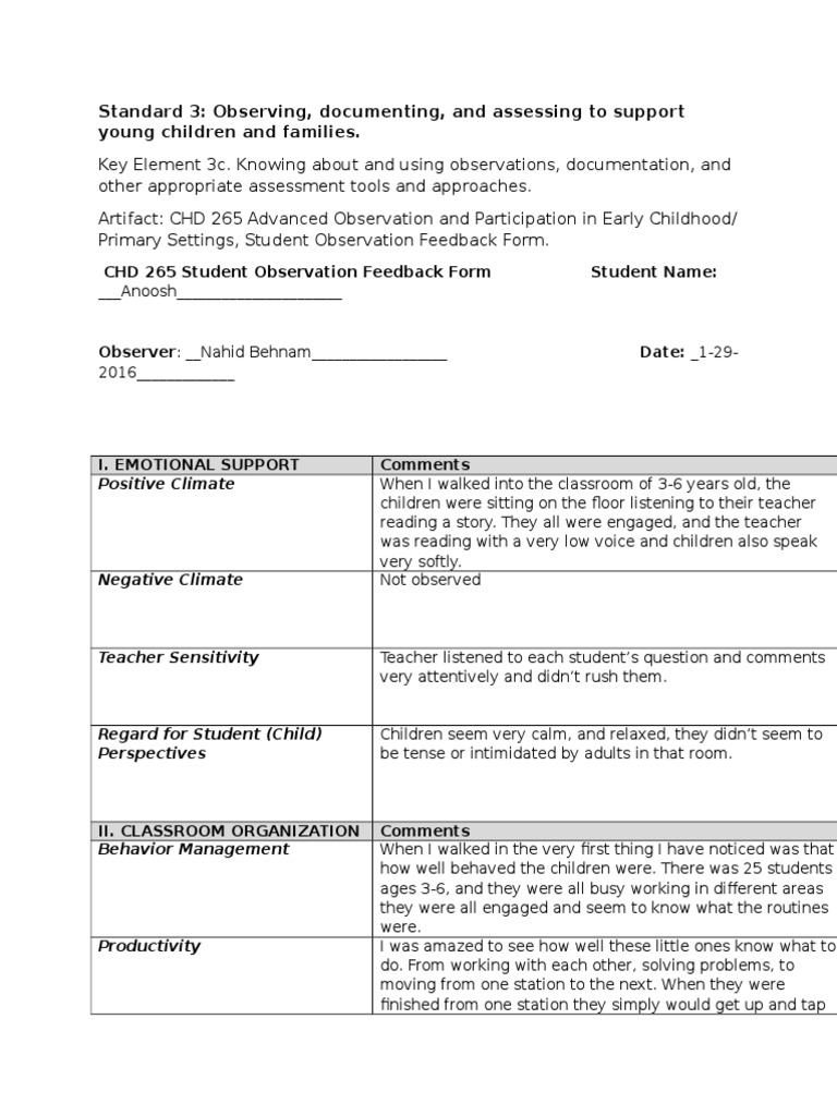 In massachusetts, licensed early childhood programs are now required to include a child assessment component in their programs. The domains of child development and early learning are discussed in different terms and categorized in different ways in the various fields and disciplines that institute of medicine and national research council. Tools of the mind visitor observation and discussion form. This early childhood observation tool was developed by the national academy of early childhood programs, a division of the national association for the education of young children. Week of the young child. Challenges in early childhood assessment 2. There are some errors in the form. In massachusetts, licensed early childhood programs are now required to include a child assessment component in their programs. Learn more about child observations examples and why child observation is important in early childhood. Evaluating and monitoring your program. European conference on organized films. We work with early childhood service providers and policymakers nationwide to find solutions to practical challenges in early childhood education and care. If you are visiting our english version, and want to see definitions of early childhood observation form in other languages, please click the language menu on the right bottom. Early childhood education observation form. In this phase, neurons are organised to form complex brain functions. Classroom practices inventory (cpi) the emergent academic snapshot (eas). Ing mathematics to explore and understand the world around. Create a subfolder in your early childhood google drive folder for observation reflections, and title it last name_observations. It's about exploration and learning, and observations play an important role in meeting the developmental. This observation lasted about fifteen minutes with a total of twelve students in the classroom. Educators can use our collection of carefully created childcare forms and templates for their observations and generate reports on the spot. In psychology the term early childhood is usually defined as the time period from birth until the age of. Educator's alike would agree that observing and documenting children's learning makes up a huge part of the job. This form of observation is intended to time track a specific behavior of a single individual or group of children. Also nursery education) is a branch of education theory that relates to the teaching of children (formally and informally) from birth up to the age of eight. Early childhood observation in an educational setting is key to ensuring proper development in young children. Teaching practice m m/e e e/p p p/a a uses effective and efficient time management strategies and transitions. Based on their careful observations of children. This video covers what children's behaviour might tell us. Traditionally, this is up to the equivalent of third grade. Attendance for young children preschool through 3rd grade.