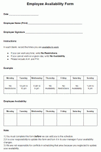 An employee availability form lets employees submit their available hours to supervisors, managers, or employers.