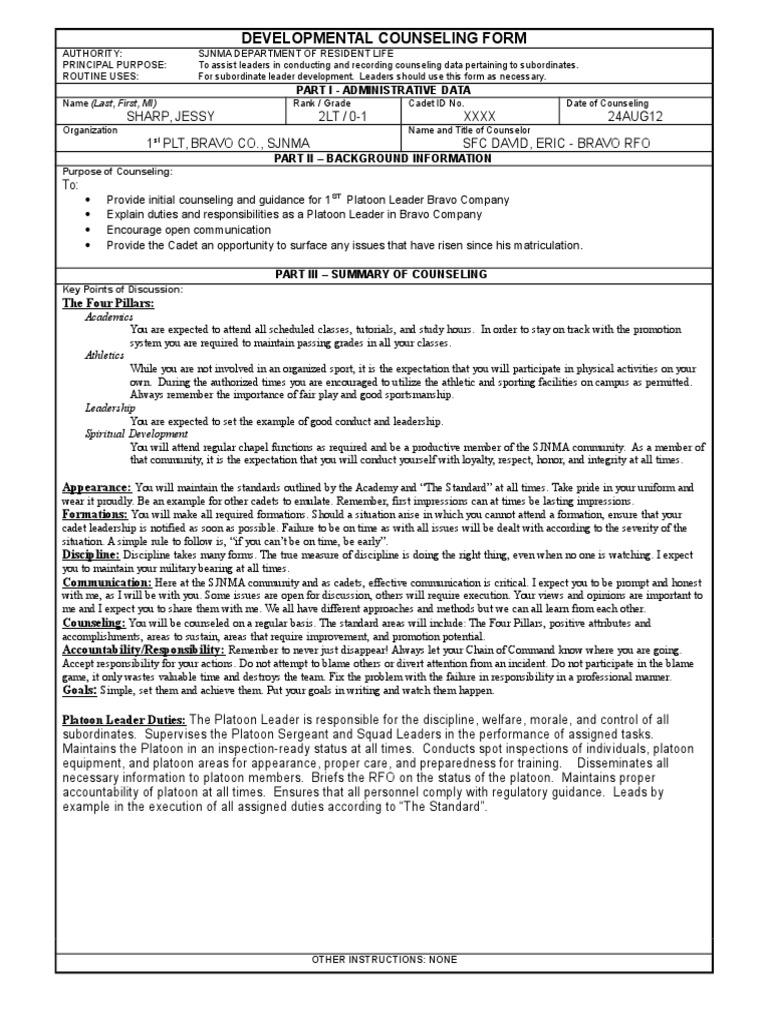 The Mentor U S Leadership Counseling Includes Over 50 Counseling Examples. As a soldier you should, at all times conduct yourself accordingly, not in a manner as to discredit yourself or the unit in or out of uniform. Its purpose is to outline the expectations of the first sergeant. Make sure you are at least 10 minutes prior to all announced formations. This counseling is to inform you of the expectations of the unit and the north carolina national guard. During your first initial counseling, you might feel a little silly or redundant. Honestly, even if it can lead to discussions. Counseling for soldiers is normally recorded on da form 4856 but other formats are allowed for the initial counseling. Other situations may arise that are not covered in this counseling session. Although, if you are a company that sells melatonin, you can create a page called sleep tight every night. If you are unsure about anything, contact me and i will work to straighten out the situation. This counseling will be the first of our quarterly formal counseling sessions. This is an example of a sample initial counseling for a first sergeant memorandum. Let's take a look at a good example. Another example could be insurance inversion. Your platoon sergeant likely endured many counselings with many different characters.