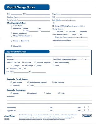 Additions and changes to a church employee's payroll would be implemented when this form is completed by click on the link to download the payroll change template form below For instance, i want to format on the myobject change form a url to include the id from a foreignkey connected object (obj) as a link. Separation information (fill in blanks): The payroll form of action is a form that contains all the information related to the employee such as hiring, change in address, total pay, rate changes, termination details etc. Payroll status change notice template. Payroll change form free to download, customize and print at your convenience and use for your hr department. This engineering change notice template is a reliable and useable framework for any normal ecn. Start a free trial now to save. Nothing removes headache from the hr department quite like online forms. Ranging from employees details to be filled, payroll queries and more, you can find everything prewritten with blank payroll forms available online. View, download and print payroll status change pdf template or form online. O voluntary with less than 72 hour notice. Event ticket template survey template order form template invoice template classroom newsletter template newsletter templates online templates word templates diary template. Whenever an employee's salary is increased, as an hr rep you'll surely appreciate an online payroll change form. Collection of most popular forms in a given sphere. Flsa model notice for employers who offer a health plan en español. 2:22 php payroll 40 просмотров. This form will allow your employees to indicate how they would like money deducted from their paychecks. Find free, downloadable change order forms and templates to ensure proper approval. Common sample templates for payroll and accounting at your business. Human resources forms are documents used by a company's hr department to recruit and manage employees. O voluntary with at least 72 hour notice separation date: Download payroll change notice doc: Smartsheet uses cookies and other tracking technologies to offer you a better browsing experience, analyze our website, and assist with our promotional and marketing efforts. Please note that all such forms and policies should be reviewed by your legal counsel for compliance. A terms & conditions change notice is a document that is used for a website to send to its users when it has made (or is about to make) updates or changes to its terms & conditions. A payroll change notice form is an important document which is used for updating the data and information of an employee or staff of a company this engineering change notice (ecn) template is free and customisable for your own ecn's. Fill out, securely sign, print or email your payroll change notice form signature of person. Free to download and print. Payroll deferral notice example in pdf. You fill out a form.