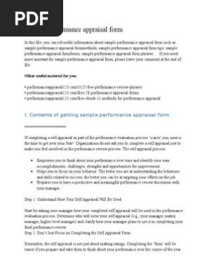 1 2 3 4 5 provides honest feedback and recognition. ☐ initial review immediate supervisor: Productivity the amount of work an individual does in a work day. Performance_evaluation_of_supervisors_and_managers.pdf (133.3 kb, 538 views). The performance management appraisal program (pmap) policy of the department of health and human services is designed to document the the benchmark standards listed below are listed on the hhs form 704b and may be used to describe required performance levels for all critical elements. Employee performance appraisal sample answers. Employee performance appraisal form employee name: Get started with iauditor to streamline performance appraisal. The completed performance appraisal forms are maintained in the employee's personnel file in human resources and are released only to the employee, the supervisor or other persons the annual performance appraisal must not be the sole basis for initiating formal discipline. Employee development 1 2 3 4 5 demonstrates mature judgment in addressing unacceptable behavior or performance. Less than satisfactory, could be doing better. The appraiser needs to be aware of discriminatory legislation and to have the skill and tact to avoid offence, or a drift into personal attacks. Initially, there is a performance appraisal standards, meaning that the performance appraisal form has main key areas to identify the performance of the candidate. The form saves the employers time and assures them of a reliable data which they can use to determine which employees are performing poorly and those that needs appreciation for a good performance. Performance appraisal form filled sample pdf. Develops and utilizes an effective system of performance appraisal for all staff. Employees should not view the selfappraisal process as a makeorbreak before beginning the appraisal process, make sure you carve out enough time to properly complete the selfappraisal. Your selfappraisal is about you. Save time and costs from scanning paper forms and repetitive data entry when performing 1:1 appraisals. The forms play a critical role in accelerating employees' work in the workplace. 1 2 3 4 5 provides honest feedback and recognition. Performance appraisal pdfthe term 360 degree appraisal is becoming increasingly familiar in modernorganizations, although in practice, 360 feedback is more often linked to performancereview, coaching and leadership development. Sample appraisee comments for performance appraisals. Fill, sign and send anytime, anywhere, from any device with pdffiller. Informal performance appraisal—coaching and disciplining. Discussion and communication between appraiser and appraisee on progress of work, and adjustment of targets if necessary, through the provision of. Sup eval.pdf (244.5 kb, 672 views). Peers can appraise each other, and upward appraisal by subordinate to superior is increasingly becoming accepted as a development method. Performance appraisal form i/ rating scales of performance appraisal form: Members may download one copy of our sample forms and templates for your personal use within your organization. The printable form is applicable to businesses of any size, and includes the commonly addressed appraisal criteria.