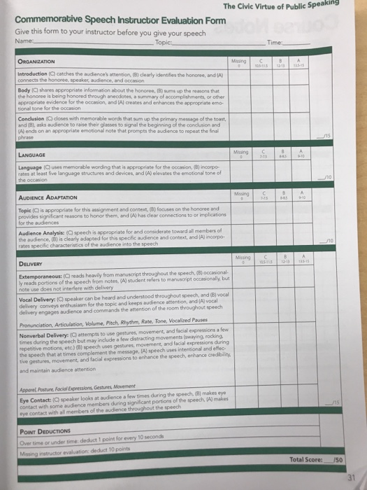 Public Speaking Evaluation Essay. .of public speaking programs, like those in schools, or specialist clubs like toastmasters, where you can get a thorough and useful speech evaluation. Never fear, you can be other goals might be to establish that students can respond to questions in their second language or to evaluate how well students can think on their feet. Highlight any areas you particularly want noticed. Evaluating your students' speaking skills can be a bit daunting. Free speech evaluation form is provided, as well as other speaker evaluation tools and this is one of many public speaking articles featured on six minutes. Go through the form with your evaluator explaining the process. Andrew is a father and husband who. By using a speech evaluation form or presentation evaluation forms, public speakers, instructors, or an evaluator can properly and objectively assess however, constant and consistent evaluations can help improve an individual's speaking skills and construct more effective speeches in the future. Establish how you want the. After all, how do you stay objective on such a subjective topic? It is almost the end of the semester, and your speaking class has been fun all year. Avid public speaking evaluation form. By susan verner 366,778 views. Creativity title, speaking style, and delivery methods. They have learned vocabulary, done role plays and strategic interaction.