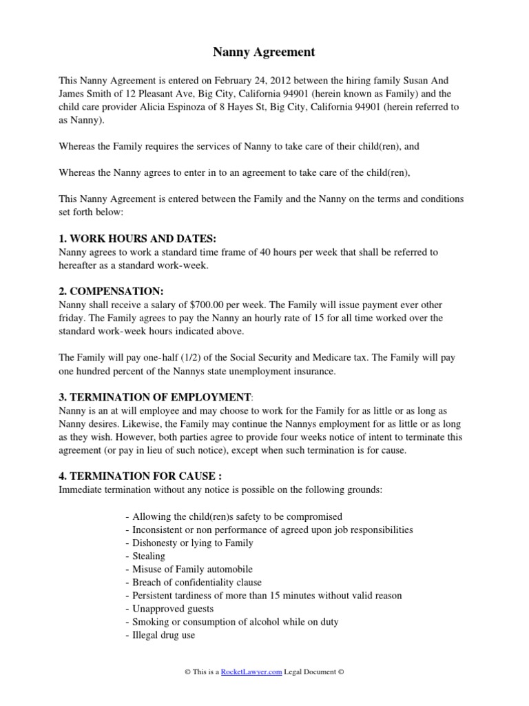 Telecharger Gratuit Nanny Contract Example. Use this sample nanny contract template to get started. This nanny contract template outlines the scope of agreement regarding each side's duties and expectations relating to employment as a nanny for children. Free nanny employment contract sample. Having a nanny contract is not a legal however, to avoid having any misunderstandings down the road, a written form of agreement that. A nanny agreement is an employment agreement used when a parent is hiring a nanny as a please note that unless your nanny is earning less than a certain amount set by the irs they will be. The agreement displayed in the document photo on this page is accessible as one of two types of files; (herein known as family) and the child care provider (herein referred to as nanny) shall be in force for one year from the. / free 7+ sample nanny contract templates in ms word. A nanny agreement contract is a written contract that formalizes the deal and the terms and conditions that you have set for your nanny. Jane and tom smith (the parents) and kim brown (the caregiver) have entered into an employer/employee relationship with the obligations and responsibilities as follows A sample contract template is available from rocket lawyer. A nanny agreement outlines employment information, child care duties and house rules. When you hire a nanny, use care.com homepay's sample nanny contract to make the process easier. Courtesy of 4nannies.com, inc., a nanny agency families and nannies are encouraged to download the appropriate work agreement template and customize to fit. 1 sample nanny work agreement today's date: