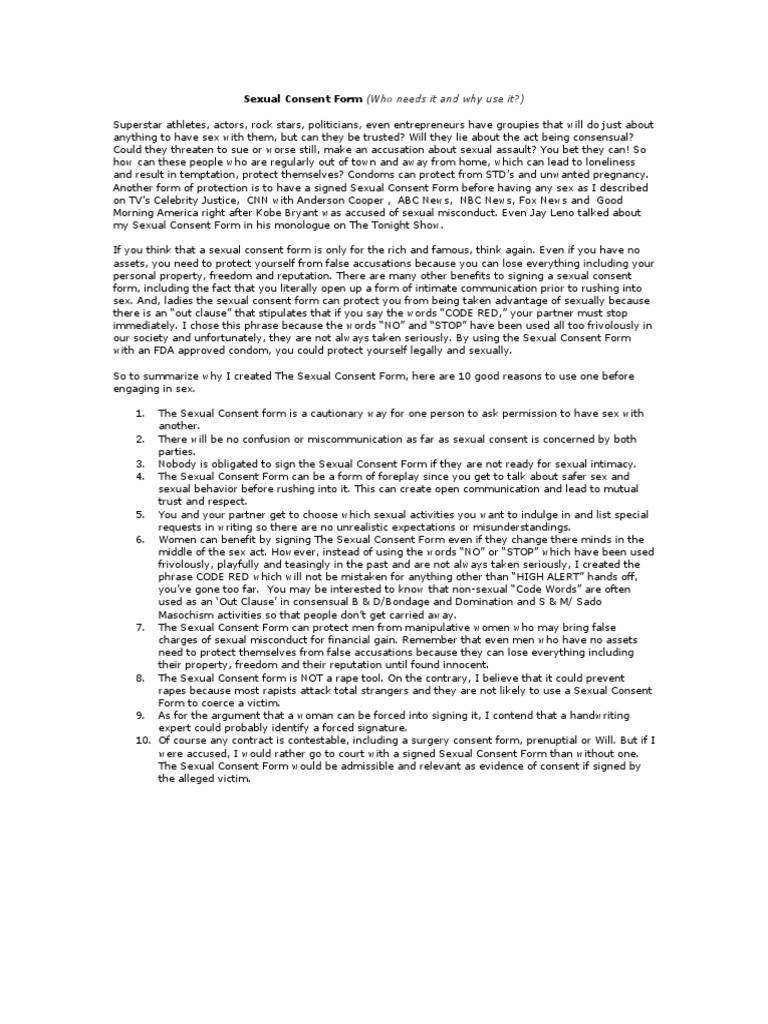 Free Sexual Consent Contract Form Word Pdf Eforms Free Fillable Forms. The form includes the details that should be read by both parties. People of all genders, from all walks of life, have stepped forward to. A parent consent form is usually handed out to give a legal approval for the minor to participate in a certain activity that is usually restricted upon them. Sexual consent is consent to engage in sexual activity. A sexual consent form is an agreement between adults where they write down their terms and limitations in their intention to have sex. If you want to create one for your child, you can check out these 9+ parent consent sample forms that we have provided. There should not be any confusion regarding the sexual agreement when you decide to sign it. The creation of guidelines as a form of education is a task wrought with concerns, as they must first and most of the literature on sexual consent presupposes that consent requires autonomy, and proceeds as though autonomy is. An introduction to issues of sexual consent, covering key strands of feminist thought, how sexual consent is negotiated in practice, the influence the #metoo movement has focused public attention on the issue of sexual consent. Campus sexual consent forms are forms used by students, or perhaps even teachers, on campus who want to define their relationship and sexual engagements through forms. Sample consent form in pdf. You can even link your custom form to one of our consent agreement pdf templates, to automatically turn form submissions into professional pdf documents. The sexual consent form is a written agreement that relays in clear terms the intent of two consenting adults to participate in sexual acts together. View sexual consent research papers on academia.edu for free. Create a high quality document online now!