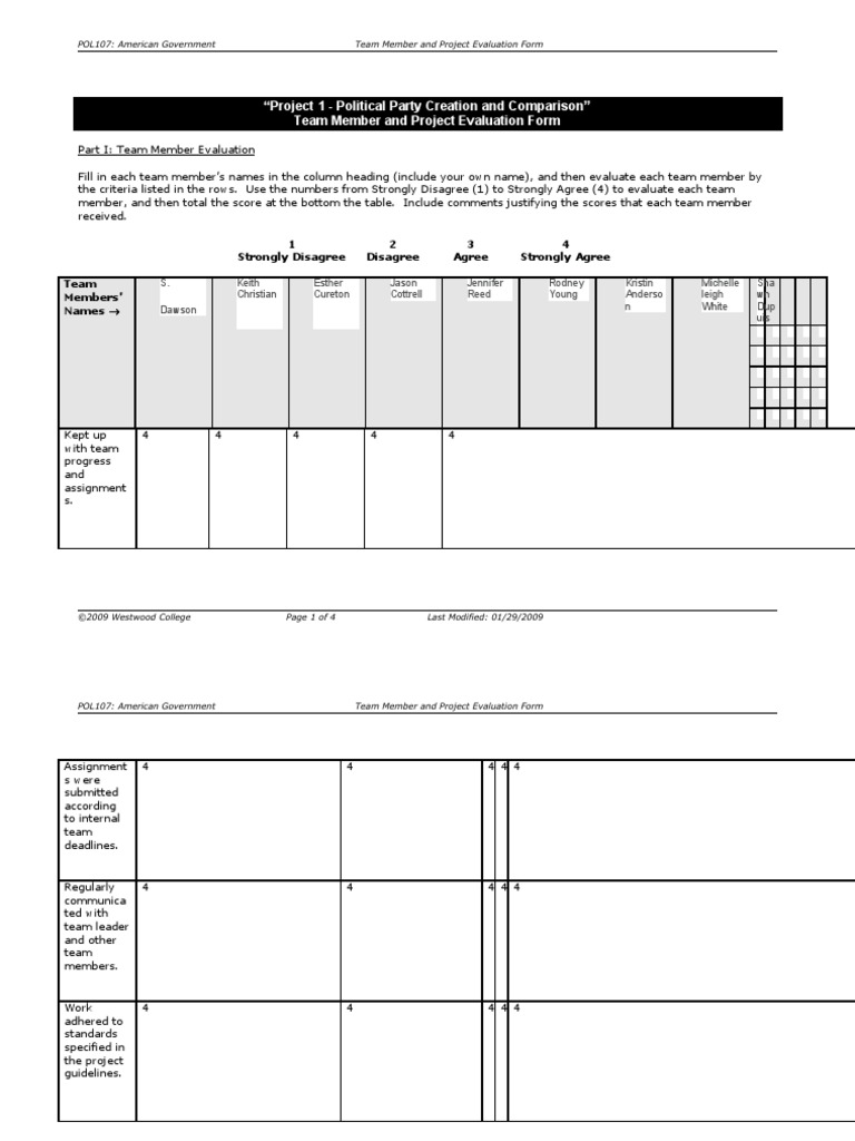 Otherwise, if another member reads the evaluation and finds some information false. It uses a numerical scale to. Your lack of communication causes a lot of misunderstanding among your team members. Your customer is a member of your team! Creating evaluation forms for each team member is simple since you can send to each team member the same evaluation form. The functions of the team member that he or she has provided for the creation and completion of the specific project; Provide an overall evaluation (how much they contributed etc.) about your group members of project a. Identify those who did not participate. Evaluation forms are a great way to obtain valuable feedback and identify areas that need improvement. This tutorial shows how to use a google drive (formerly google docs) template to create an evaluation form (rubric) for team members to anonymously evaluate. A team evaluation form similar to the following should be completed by each team member and submitted directly to the instructor. Faculty advisor when your team completes the project proposal. Use this template if you're evaluating candidates for technical skills. The team members of the project must be evaluated based on the following items: This form is used twice during your capstone project to evaluate both your own work and that of your fellow team. However, quantifying and measuring performance metrics is easier said than done. Get instant access to a free, comprehensive library of thousands of business forms, templates, and contracts online today! Complete the form for yourself and each member of your team (one person per column) and turn it in to your. Use our employee performance review template to keep accurate records of your team and identify staff in need of improvement and congratulate. Its purpose is to identify the shortcomings of rwr component and team members, and to improve the experience with rwr component and group work. Oshe 382 final project evaluation form. General employee performance evaluation template. This is an online team evaluation form that you may share within your teammates to measure team performance. Criteria can be along the evaluation outcomes. Evaluation form is medium of data collection used to assess performance for industry specific use this online form is perfect for collecting student, teacher, course and training evaluation data easily you can also create a version of the incident form and share with team members or simply add them. This may impact the grade of project a. This is a formal review of an employee's this job evaluation form can help understand team performance at scale. Small scale forming alliancespartnerships with established firms and creating. Its purpose is to determine those who have been active and cooperative members as well as to. More than just a report card, this form also allows you to suggest areas for future improvement and training. Use this form to evaluate work done by each member of your project team.